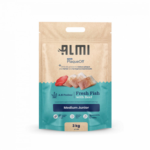 Granule ALMI sú plné kvalitných surovín, ktoré šteňa potrebuje na zdravý rast a vývoj. Obsahujú čerstvú rybu a hovädzie mäso, ktoré sú zdrojom bielkovín potrebných na pevné a silné svaly. Ďalej je v krmive hrach, jablká, repná vláknina a ryža pre lepšiu stráviteľnosť. V našom krmive nenájdete umelé farbivá a na zachovanie čerstvosti a kvality je prirodzene konzervované rozmarínovým extraktom. Granule ALMI sú obohatené o PlaqueOff™, u ktorého je klinicky dokázané, že znižuje zubný povlak, zubný kameň a zlepšuje zlý dych.