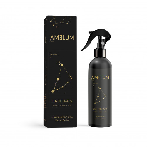 Cieľom Amelum je pozvať vás na nezabudnuteľný výlet aromaterapiou... Vône sú mocná sila, ktorá vyvoláva spomienky, sprevádza dôležité okamihy naraz. Všetky vône Amelum sú vyrobené iba z tých najkvalitnejších surovín a sú navrhnuté tak, aby navodili pozitívnu náladu, dobrú emočnú energiu. Filozofiou spoločnosti Amelum je vytvoriť ďalšiu úroveň aromaterapeutických produktov. Charakteristické rysy nasledujúcich parfémov: Luxusné, exkluzívne: najvyššia kvalita a iba starostlivo vybrané prírodné ingrediencie. Sprej: možno použiť ako parfum na vytvorenie aromatickej atmosféry priestorov a automobilov. Lahodná a obľúbená vôňa zdvihne náladu, povznesie. Perzistentná aróma . Koncentrácia sa rovná parfému najvyššej kvality. Koncentrácia vône navyše zodpovedá triede parfumov – obsahuje minimálne 20% vonnej esencie. Taká koncentrácia sa nachádza iba v prémiových parfumových kompozíciách, preto sú tieto parfumy jedinečné. Aromatická pomôcka pre meditáciu a kreativitu, Zen Therapy je zmes uspokojivej vanilky, hladkého jantáru a pižma, ktorá dokáže rozžiariť myseľ, uvoľniť negatívnu energiu a navodiť pocit pokoja. Použitie: odomknite funkciu spreja stlačením malého okrúhleho tlačidla na strane spreja. Nastriekajte 1-5krát do vzduchu mimo tvár a telo. Nádobu držte zvisle a krúživými pohybmi striekajte do voľného priestoru v miestnosti. Upozornenie : Len na vonkajšie použitie. Horľavý. Držte mimo dosahu detí. Nestriekajte priamo na potraviny, ľudí, domáce zvieratá, rastliny a povrchy.