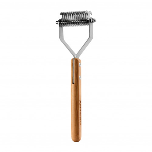 Funkcie Oválna bambusová rukoväť s kovovým upevnením na hlave, ktorá odolá aj veľkej námahe . Môže sa použiť na vytrhávanie vypadávajúcich chlpov u psov s dvojitou a krátkou srsťou , strihanie uzlov a spleti a dokonca pomáha pri odstraňovaní podsrsti a vytrhávaní tvrdých chlpov. Kolekcia Artero Supercoat L Nature má jednu stranu s 11 zubami, ktoré umožňujú prístup do veľmi hustej srsti, veľkých spletencov a nahromadených plesní, a druhú stranu s 21 zubami pre stredne hustú srsť, malé spletence, uzly a povrchové úpravy. Kolekcia Artero Supercoat M Nature má jednu stranu so 7 zubami, ktoré umožňujú prístup do veľmi hustej srsti, veľkých spletencov a nahromadených plesní, a druhú stranu s 13 zubami pre stredne hustú srsť, malé spletence, uzly a povrchové úpravy.