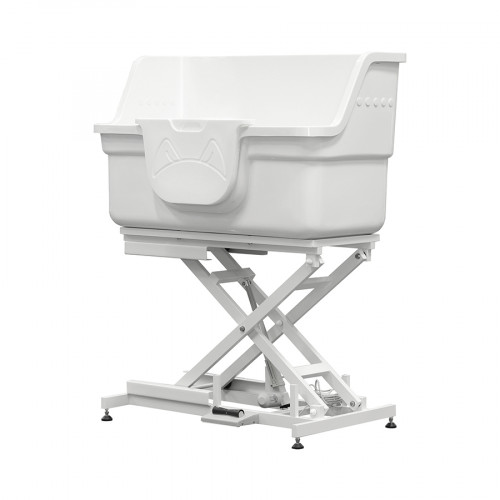 Námorná sklolaminátová vaňa pre domáce zvieratá Elektronický pedálový zdvih pre nastavenie výšky do ideálnej polohy pre strihača v závislosti od psa. Oceľová tyč na pripevnenie vodítok odolných voči úniku pre psy a mačky Odnímateľné plastové stredové dvierka pre prístup veľkých psov. Nádoba má plastovú základňu, ktorá umožňuje rýchle odtekanie vody. Plastová zdvíhacia plošina pre pohodlnú prácu s menšími psami a mačkami. Zvýšená nádoba na bokoch a zadnej strane zabraňuje striekaniu.