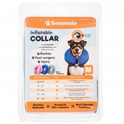 Bencmate Inflatable Collar je nafukovací obojok pre psov a mačky, v poťahu z mäkkého plyšu v praktickej šedej farbe. Mimoriadne pohodlná alternatíva k pevným pooperačným obojkom vo forme kužeľa pre zviera. Nafukovací pooperačný obojok vo forme donutu môžete psovi alebo mačke nasadiť priamo na krk alebo ho pripevniť na denný obojok vášho miláčika. To bude fungovať obzvlášť dobre v prípade domácich zvierat, ktoré sa ľahko oslobodia z obojkov a vyžadujú starostlivosť po zákroku. Nafukovací obojok ľahko obmedzí prístup zvieraťa k ranám, zraneniam, stehom atď., čím ich chráni pred uhryznutím alebo olizovaním od vášho domáceho maznáčika. To zase môže urýchliť hojenie rán, znížiť riziko sekundárnych infekcií a komplikácií a umožniť vášmu miláčikovi rýchlejšie sa zotaviť. Ide o perfektné riešenie pre majiteľov psov a mačiek, ktorí chcú svojmu psovi alebo mačke poskytnúť maximálny komfort pri rekonvalescencii. zorné pole zvieratka, je mäkké - pes v ňom môže mačka ležať a spať, nepoškodzuje nábytok - zvieratko sa v ňom môže normálne pohybovať, nedezorientuje, pretože neruší vnímanie okolia znie ako obyčajné kónické obojky. Ako používať: Prevlečte bežný obojok vášho domáceho maznáčika cez vnútorné popruhy goliera. Nafúknite golier cez ventil a zatvorte. Obojok by nemal byť tvrdý. Nasaďte svojmu miláčikovi obojok s golierom a zapnite suchý zips na golieri pre nastavenie veľkosti. Neuťahujte príliš. Ako čistiť: Ak chcete vyprať plyšový poťah goliera (program na pranie jemných tkanín), rozopnite zips a vyberte nafukovaciu vložku. Veľkosti: Pred zakúpením obojku zmerajte obvod krku vášho psa alebo mačky! Veľkosť goliera: Obvod krku: Šírka goliera: Hmotnosť goliera: S 15,2 - 22,8 cm 19,1 cm 73g M 22,8 - 30,5 cm 23,9 cm 102 g L 30,5 - 45,7 cm 38, 9 cm 203 g cm 9 cm - XL 45,5 g pre plemená 45,5 g s dlhými ňufákmi a/alebo končatinami zvoľte väčšiu veľkosť. Ak je obvod krku vášho domáceho maznáčika medzi dvoma veľkosťami, vyberte si väčšiu. Malé veľkosti obojkov Bencmate sú ideálne pre šteňatá, mačiatka a dospelé hračky plemena Poznámka: V niektorých situáciách, napr. keď sa zviera intenzívne škriabe, nemusí byť nafukovací obojok dostatočne účinný pri zamedzení prístupu k ranám. Dohliadajte na svojho domáceho maznáčika, aby ste sa uistili, že obojok funguje správne. Aj keď je vyrobený z odolných materiálov, obojok nie je žiadne hryzátko. Nedovoľte, aby ho váš maznáčik uhryzol alebo poškriabal.