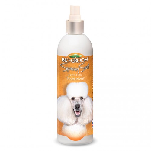 Bio-Groom Spray Set rýchlo a jednoducho dodá srsti požadovanú tvrdosť a tvar. Udrží tvar účesu aj v podmienkach vysokej vlhkosti. Prípravok bol vytvorený špeciálne pre plemená, ktoré na výstavách vyžadujú ozdobný účes a tvrdú srsť. Rýchlo schne a nezanecháva vlasy lepkavé ani tuhé. Nedrolí sa a srsť sa ľahko rozčesáva za mokra aj za sucha. Má antistatický účinok a chráni vlasy pred stratou prirodzenej vlhkosti. Prípravok sa pri kúpaní ľahko zmýva. Neobsahuje lak a nepoškodzuje vlasy. Nespôsobuje podráždenie. Bezpečné použitie. Produkt pre psov a mačky Neobsahuje: Parabény a oleje. Spôsob použitia: Nastriekajte na suchú alebo vlhkú srsť. Podľa potreby upravte pomocou kefy alebo hrebeňa.