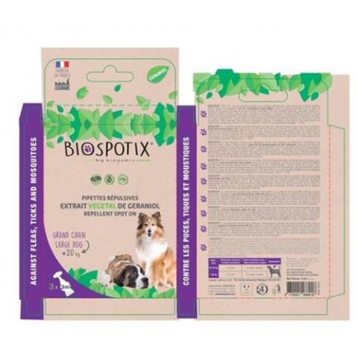 Charakteristika BIOGANCE Biospotix Dog spot-on L-XL Repelentný roztok pre psy proti blchám, kliešťom a komárom s obsahom rastlinného extraktu geraniolu, s ochranou proti napadnutiu po dobu max. 4 týždne.