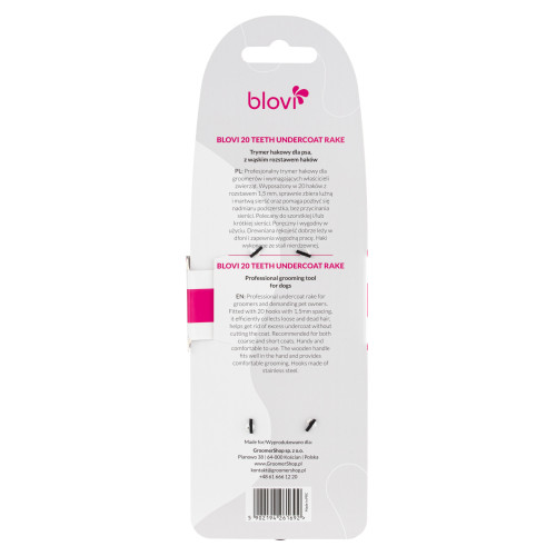 Hrable na podsrst Blovi s 20 zubami sú profesionálny nástroj na úpravu srsti určený na efektívne odstraňovanie odumretej podsrsti u psov s drsnou, krátkou srsťou. Dokonale spĺňa potreby profesionálov a majiteľov domácich zvierat, ktorí si cenia presnosť, odolnosť a vysokú efektivitu počas úpravy srsti. Pravidelné používanie tohto modelu umožňuje efektívne odstraňovanie prebytočných odumretých chlpov, čo sa premieta do lepšej cirkulácie vzduchu v blízkosti pokožky a zlepšenia celkového zdravia vášho domáceho maznáčika. Pomocou 20 presne umiestnených háčikov s úzkym rozstupom 1,5 mm zastrihávač Blovi bez námahy preniká aj do hustej srsti a dosahuje priamo k podsrsti. Umožňuje efektívne zhromažďovanie uvoľnených chlpov bez rizika ich porezania alebo poškodenia vrchnej srsti. Vďaka háčikom vyrobeným z odolnej nehrdzavejúcej ocele zastrihávač zaisťuje dlhodobú odolnosť a spoľahlivosť, a to aj pri intenzívnom používaní v salóne. Drevená rukoväť prirodzene a bezpečne padne do ruky, čím znižuje únavu počas dlhých strihaní. Hladké, tmavé drevo nielen zvyšuje estetický vzhľad nástroja, ale zaisťuje aj vysoké pohodlie tým, že zabraňuje skĺznutiu. Tento praktický a ľahko použiteľný nástroj vám poskytuje úplnú kontrolu nad procesom strihania. Kľúčové vlastnosti hrablí Blovi s 20 zubami: 20 háčikov s rozostupom 1,5 mm. Odporúčané pre hrubú a krátku srsť. Účinne odstraňuje odumretú podsrsť. Pravidelné používanie podporuje správnu cirkuláciu vzduchu v blízkosti pokožky. Nereže ani nepoškodzuje zdravú srsť. Hlava z nehrdzavejúcej ocele. Pohodlná drevená rukoväť zabraňuje šmýkaniu.