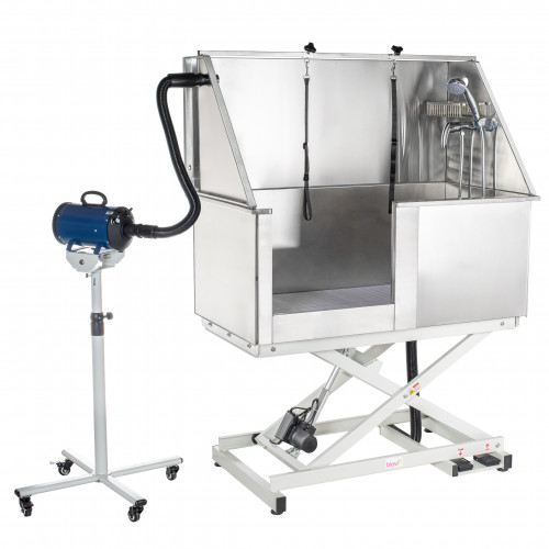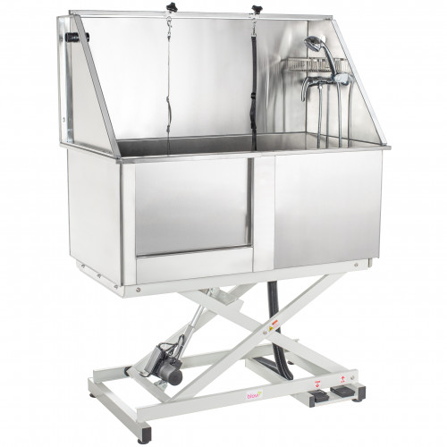 Profesionálna udržiavacia vaňa Blovi, elektricky zdvihnutá, vyrobená z nehrdzavejúcej ocele (typ 304). Extrémne odolné a esteticky vyrobené. Vaňa má posuvné dvere, obojstranný výložník na pripevnenie psíka, vaňovú batériu so sprchou a držiak na kozmetiku. Konektor umožňuje namontovať hadicu zo stacionárnej/stojanovej sušičky na boku. Odtok s priemerom 45 mm. Výška sa nastavuje pomocou vodeodolných nožných pedálov Špecifikácia oceľovej vane Blovi: vnútorná šírka: 121 cm (vonkajšia: 129 cm) vnútorná hĺbka: 60 cm (vonkajšia: 69 cm) šírka predných dverí: 49 cm nastavenie výšky (podlaha/spodok vane) : od 35 cm do 70 cm výška predného okraja vane: 79 až 114 cm (vnútorná výška prednej steny: 44 cm) výška zadného okraja vane: od 140 cm do 175 cm výška vstupného prahu: od výšky 42 cm panelu (bez zdvihu): 100 cm vstup do vane: na ľavej strane hmotnosť: 81 kg