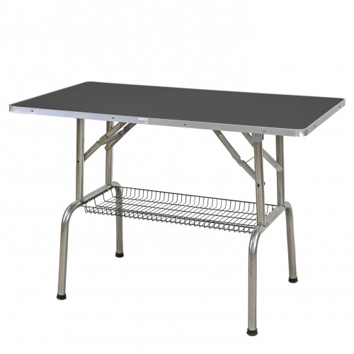 Stolík na starostlivosť o zvieratá s doskou s rozmermi 120 cm x 60 cm. Výška v rozloženom stave: 78 cm. Doska stola je pokrytá protišmykovou podložkou, ktorá sa ľahko udržuje v čistote. Pod stolom sa nachádza praktický košík na príslušenstvo, do ktorého sa zmestí potrebné vybavenie, ako napr. žiletky, kefy, hrebene a zastrihávače. Súprava obsahuje aj obojstranný výložník a šnúrky na zavesenie psíka. Nevyhnutný produkt pre kozmetické salóny a chovateľov. Technické údaje rozmery stolovej dosky: 120 x 60 cm celková výška: 78 cm výložník: obojstranná hmotnosť: 25 kg farba stola: na výber (modrá, ružová, fialová, čierna)