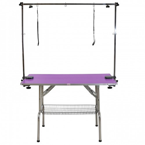 Stôl na starostlivosť o zvieratá s doskou s rozmermi 120 cm x 60 cm. Výška v rozloženom stave: 78 cm. Doska stola je pokrytá protišmykovou podložkou, ktorá sa ľahko udržuje v čistote. Pod stolom sa nachádza praktický kôš na príslušenstvo, do ktorého sa zmestí potrebné vybavenie, ako napr. žiletky, kefy, hrebene a zastrihávače. Súčasťou sady je aj obojstranný výložník a šnúrky na zavesenie psíka. Nevyhnutný produkt pre kozmetické salóny a chovateľov. Technické údaje rozmery dosky stola: 120 x 60 cm celková výška: 78 cm výložník: obojstranná hmotnosť: 25 kg farba stola: na výber (modrá, ružová, fialová, čierna)