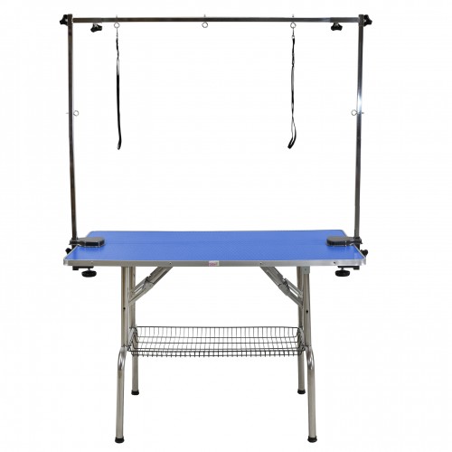 Stolík na starostlivosť o zvieratá s doskou s rozmermi 120 cm x 60 cm. Výška v rozloženom stave: 78 cm. Doska stola je pokrytá protišmykovou podložkou, ktorá sa ľahko udržuje v čistote. Pod stolom sa nachádza praktický košík na príslušenstvo, do ktorého sa zmestí potrebné vybavenie, ako napr. žiletky, kefy, hrebene a zastrihávače. Súčasťou sady je aj obojstranný výložník a šnúrky na zavesenie psíka. Nevyhnutný produkt pre kozmetické salóny a chovateľov. Technické údaje rozmery stolovej dosky: 120 x 60 cm celková výška: 78 cm výložník: obojstranná hmotnosť: 25 kg farba stola: na výber (modrá, ružová, fialová, čierna)