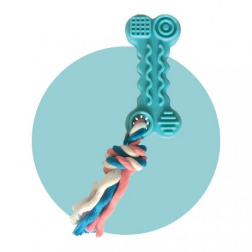 Hračka pre šteňatá modrá kosť s lanom 15 cm. Ideálne pre šteniatka, na hryzenie a zabavenie.