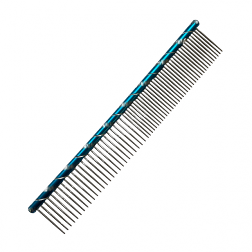 Jednoradový efektný oceľový hrebeň s väčšími a menšími rozostupmi zubov. Zuby majú zaguľatenú špičku, nedochádza tak k poraneniu kože psa. Vhodný na prečesanie a finálne česanie srsti, je možné použiť aj pri strihaní. Použitie: používajte v smere rastu srsti. Parametre produktu: hmotnosť: 34g, celková dĺžka: hrebeňa 19cm, dĺžka zubov 2,5cm, celkom zubov: 63ks z toho 27zubov 0,4cm rozostup a 36 zubov 0,2cm rozostup. *Všetky údaje sú približné.