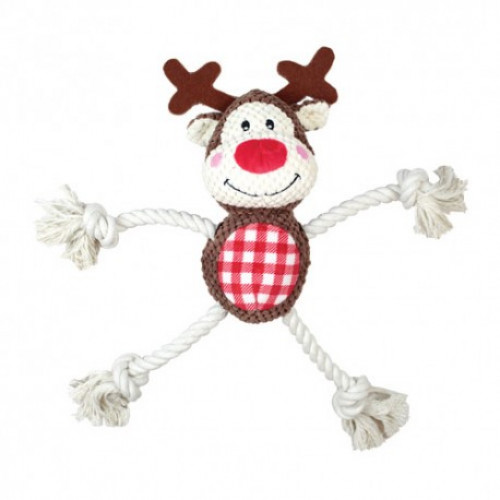 Plyšový vianočný sob s lanami pre psov 43 cm má pískatko na bruchu a ruky a nohy sú z lana. Ideálna hračka pre hry s pánom.