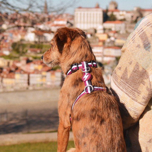 Chrbtový postroj Dashi Stripes Purple & Black - nastaviteľný postroj na stráženie psa, fialové a čierne pruhy - XS