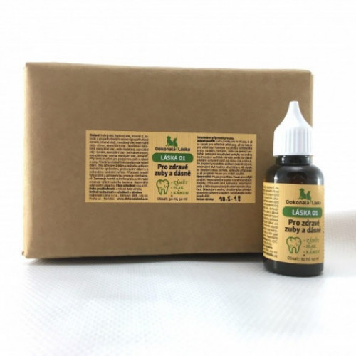 Prípravok je určený na podpornú starostlivosť o ďasná a zuby. Pôsobí protizápalovo a podporuje hojenie ďasien. Vďaka účinným látkam a spôsobu aplikácie dochádza k správnemu prekrvovaniu ďasien ak celkovému uvoľneniu zvieraťa. Prípravok pôsobí fytoncídne a antisepticky, obmedzuje rast baktérií. Zamedzuje tvorbe zubného povlaku a tým tiež obmedzuje zubný kameň u psa. Napomáha odstráneniu zápachu. SPÔSOB POUŽITIA 2 až 4 kvapky pre malé psy, 6 až 12 kvapiek pre stredne veľké psy, až 20 kvapiek pre veľké psy. Naneste na plôšku očisteného prsta alebo na gázu, poprípade na jemnú kefku. Jemnými krúživými pohybmi v smere hodinových ručičiek vtierajte zmes do ďasien a jemne masírujte ďasná v oblasti zubného krčku po dobu cca 1 minúty. Do zlepšenia vykonávajte aplikáciu až dvakrát denne, optimálne 2 hodiny pred alebo po kŕmení. Až dôjde k zlepšeniu stavu v papuli zvieraťa, aplikujte prípravok 1x až 3x týždenne. UPOZORNENIE Veterinárny prípravok pre psov. Pred použitím vždy pretrepte. Len pre zvieratá. Len na vonkajšie použitie. Prípravok nie je náhradou veterinárnej starostlivosti a liečiv odporúčaných veterinárnym lekárom. Skladujte v suchu, chráňte pred priamym slnečným žiarením a teplom. Uchovávajte mimo dosahu detí. Veterinárny prípravok LÁSKA 01 Pre zdravé zuby a ďasná nie je vhodný pre psy s poruchami trávenia a zvlášť pre psy s poruchou pankreasu. Pre takéto psy je určený prípravok LÁSKA 01S. Prípravok nie je určený pre gravidné sučky. Neobsahuje alkohol. Pokiaľ je u psa prítomná porucha funkcie obličiek, pečene alebo srdca, konzultujte použitie prípravku s veterinárom alebo u výrobcu. Čas použiteľnosti: 1 rok od dátumu výroby
