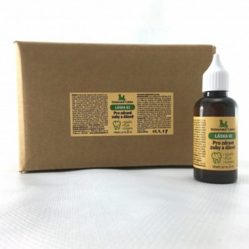 Prípravok je určený na podpornú starostlivosť o ďasná a zuby. Pôsobí protizápalovo a podporuje hojenie ďasien. Vďaka účinným látkam a spôsobu aplikácie dochádza k správnemu prekrvovaniu ďasien ak celkovému uvoľneniu zvieraťa. Prípravok pôsobí fytoncídne a antisepticky, obmedzuje rast baktérií. Zamedzuje tvorbe zubného povlaku a tým tiež obmedzuje zubný kameň u psa. Napomáha odstráneniu zápachu. SPÔSOB POUŽITIA 2 až 4 kvapky pre malé psy, 6 až 12 kvapiek pre stredne veľké psy, až 20 kvapiek pre veľké psy. Naneste na plôšku očisteného prsta alebo na gázu, poprípade na jemnú kefku. Jemnými krúživými pohybmi v smere hodinových ručičiek vtierajte zmes do ďasien a jemne masírujte ďasná v oblasti zubného krčku po dobu cca 1 minúty. Do zlepšenia vykonávajte aplikáciu až dvakrát denne, optimálne 2 hodiny pred alebo po kŕmení. Až dôjde k zlepšeniu stavu v papuli zvieraťa, aplikujte prípravok 1x až 3x týždenne. UPOZORNENIE Veterinárny prípravok pre psov. Pred použitím vždy pretrepte. Len pre zvieratá. Len na vonkajšie použitie. Prípravok nie je náhradou veterinárnej starostlivosti a liečiv odporúčaných veterinárnym lekárom. Skladujte v suchu, chráňte pred priamym slnečným žiarením a teplom. Uchovávajte mimo dosahu detí. Veterinárny prípravok LÁSKA 01 Pre zdravé zuby a ďasná nie je vhodný pre psy s poruchami trávenia a zvlášť pre psy s poruchou pankreasu. Pre takéto psy je určený prípravok LÁSKA 01S. Prípravok nie je určený pre gravidné sučky. Neobsahuje alkohol. Pokiaľ je u psa prítomná porucha funkcie obličiek, pečene alebo srdca, konzultujte použitie prípravku s veterinárom alebo u výrobcu. Čas použiteľnosti: 1 rok od dátumu výroby
