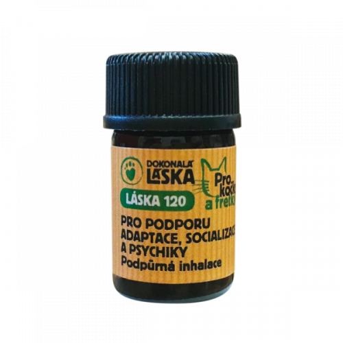 Inhalačná zmes určená pre mačky a fretky s prejavmi posttraumatického stavu alebo pri akútnej traume. Teda stavu, ktorý sa prejavuje poruchou adaptácie a socializácie, bojazlivosťou, uzavretím, úzkosťou, agresivitou, a to aj z dôvodu strachu o seba samého, poruchou učenia, roztržitosťou, nadmernou excitáciou a emočnou nestabilitou. Inhalačná cesta je pre mačky úplne bezpečná a vhodná aj pre kolektív zvierat. Zmes je možné využiť aj na priamu inhaláciu z fľaštičky pri práci so zvieraťom. Odporúčame spočiatku používať „handrikovú“ metódu. Účinnú látku kvapnete na kúsok látky alebo handričky alebo o ne utrite viečko z prilepenú účinnú látku. Potom handričku poskytnite mačičke, položte ju zhruba pol metra až meter od nej. Sama si potom určí, ako ďaleko od účinnej látky zdržiavať alebo či si ju chce prípadne utierať o srsť. Až skončí saturácia účinnou látkou, mačka sa sama od handričky vzdiali. SPÔSOB POUŽITIA: Prípravok nepoužívajte na kožu ani srsť. Pre priestorovú inhaláciu je vhodný studenoprúdový difuzér s filtrom: 1-2× denne nakvapkajte na filter 2-5 kvapiek (podľa veľkosti priestoru) a difuzér zapnite na dobu 1 hodiny. V neprítomnosti je možné využiť časovacie hodiny. / Inhalácia z fľaštičky: otvorte fľaštičku a položte pred zviera, ktoré si samovoľne naberie nozdrami potrebné množstvo prípravku. Maximálna doba inhalácie by nemala presiahnuť 10 minút denne. / Inhalácia z látky: na šatku alebo látku naneste 2 kvapky a umiestnite v blízkosti zvieraťa tak, aby malo možnosť odchodu. Optimálne je vyriešiť u zvieraťa príčinu jeho problémov (v súčinnosti s behaviorálnymi postupmi) a následne prestať s používaním prípravku. V prípade dlhodobého (ak aplikujete prípravok dlhšie ako 1 mesiac) alebo trvalého používania vykonávajte raz mesačne týždennú prestávku. Teda aplikáciu prípravku nevykonávajte po dobu 1 týždňa v každom mesiaci. Dlhodobé používanie je vhodné iba v prípadoch, keď nie je možné vyriešiť príčinu problémov a prípravok pomáha „iba” zmierňovať symptómy a optimalizuje prejavy a stav zvieraťa. UPOZORNENIE: Veterinárny prípravok určený pre mačky a fretky na inhaláciu. Len pre zvieratá. Len na vonkajšie použitie. Skladujte v suchu, chráňte pred priamym slnečným žiarením a teplom. Neobsahuje alkohol. Uchovávajte mimo dosahu detí. Prípravok nenahrádza veterinárnu starostlivosť. Prípravok nie je náhradou za veterinárne liečivá, nejedná sa o liek. Používanie prípravku v prípade ochorenia srdca, pečene a obličiek konzultujte s poradňou Dokonalé Lásky na +420 731 381 380 alebo poradna@dokonalalaska.cz. Čas použiteľnosti: 2 roky od dátumu výroby.