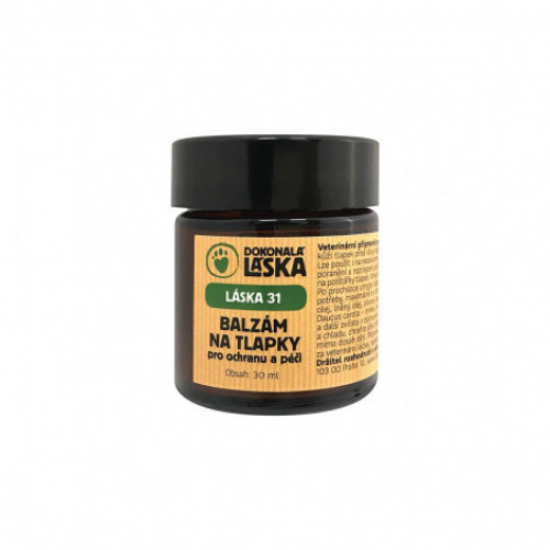 Balzam LÁSKA 31 na labky a ňufák sa hodí: vysychanie kože, popraskanie, zvrásnenie, štiepivosť. Pomoc a ochrana v zimnej a letnej sezóne, je skvelý aj v iných situáciách: otlaky, pazúriky, cecíky. Čisto prírodný ochranný balzam pre aplikáciu na zrohovatenú kožu labiek a suchý ňufák. Krémovito pastovitá zmes olejov s účinnými esenciálnymi olejmi ošetruje kožu labiek, ňufáku a chráni pred vplyvmi nepriaznivého počasia. V zime sneh, ľad, blato či nasolená brečka. V teplých mesiacoch sa jedná o horúci betón alebo asfalt. Prípravok je vhodný na ochranu pred poškodením vankúšikov pri prechádzke, tiež na ošetrenie podráždených labiek zimou, vlhkom a zmenami teplôt. Možno použiť aj na nezapálené otlaky. Zloženie esenciálnych olejov pôsobí hojivo a mierne dezinfekčne. Podporuje hojenie drobných poranení a rozstrapkanie vankúšikov labiek. Pri pravidelnom používaní poskytuje prirodzenú dotáciu kožnej bunky, pôsobí preventívne a podporuje prirodzenú pružnosť a odolnosť kože. Prípravok je veľmi vhodný pre starostlivosť o ňufák. Pravidelné používanie napomáha ochrane pred stlštením vrchnej kože rohoviny ňufáku a nepríjemným nadmerným odlučovaním kožných buniek. Spôsob použitia: naberte malé množstvo, vmasírujte a nechajte pôsobiť. Pre aplikáciu pred prechádzkou môžete aplikovať väčšie množstvo. Po prechádzke umyte labky čistou vodou a po uschnutí premažte. Aplikácie je možné vykonávať podľa potreby, maximálne 6 x denne.