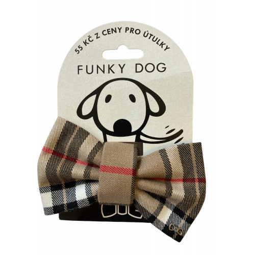 Károvaný motýlik je nutnou výbavou každého elegána, či už je to sučka alebo psík. 55 Kč = 2,15 € z každého motýlika venujeme psíkom v núdzi. Motýliky sú ručné práce, väčšia časť výroby prebieha v chránených dielňach. Motýlik sa na obojok alebo postroj pripevňuje pomocou suchého zipsu. Psíkom motýlik nevadí, ani z neho nebývajú nervózni. Motýlik je prispôsobený na denné nosenie, nie je to len móda na slávnostné príležitosti. Motýlik je symbol podpory útulkov, každý, kto nosí FUNKY DOG svetu ukazuje, že podporuje svojich kamarátov útulkáčov.