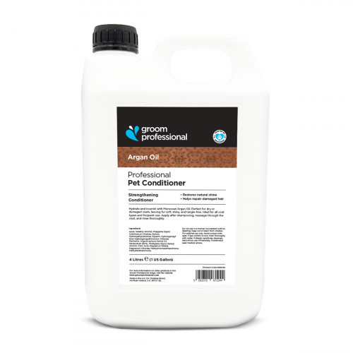 Groom Professional Argan Oil Conditioner je intenzívne hydratačný a regeneračný kondicionér s marockým arganovým olejom. Rýchlo preniká do srsti, obnovuje lesk a hebkosť a posilňuje srsť. Tento kondicionér je ideálny pre dlhú, suchú a poškodenú srsť. Tento koncentrát 1:10, určený pre salóny pre domáce zvieratá, strihačov a chovateľov, je ideálny na použitie na dlhú, suchú a poškodenú srsť. Pre dosiahnutie najlepších výsledkov najskôr umyte svojho psa šampónom z tejto rady. Potom naneste malé množstvo zriedeného kondicionéra na mokrú srsť a dôkladne vmasírujte. Nechajte pôsobiť približne 5 minút a potom opláchnite teplou vodou. Zloženie: Aqua, Cetaeryl Alcohol, Propylene Glycol, Cetrimonium Chloride, Parfum, Hydroxycelulóza, Glycerín, Hydroxypropyl Guar, Hydroxypyltrimonium Chloride, Panthenol. Argaia Spinosa Kernel Oil, Terasodium EDTA, Triethylene Glycol, Benzyl Alcohol, Kyselina citrónová, Dusičnan horečnatý, Chlorid horečnatý, Methylchloroisothiazolinone, Methylisothiazolinone.