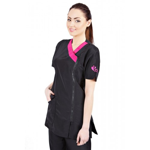 Pohodlná mikina na úpravu srsti od značky Groom Professional, model Rimini. Vyrobená zo 100% polyesteru, ktorý zabraňuje zachytávaniu zvieracích chlpov a ľahko sa čistí. Tento model sa vyznačuje mierne priliehavým strihom, moderným dizajnom a pohodlím pri nosení. Mikina má jedno vrecko a vyšívanú aplikáciu s logom výrobcu na ramene. Zapínanie na zips. Polovičná dĺžka rukáva - po lakeť. Čierna mikina s ružovým lemom. Rozmery mikiny Groom Professional Rimini: Veľkosť: Celková dĺžka (A) Šírka pod pazuchami (B) Dĺžka od goliera (C) Dĺžka rukáva (D) Šírka v páse (E) S 70 48 30 6 44 M 71 50 31 7 45 L 73 52 33 7 47 XL 76 54 35 9 50