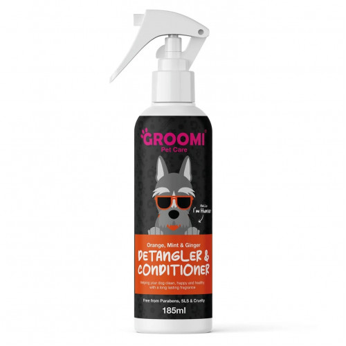 Groomi Detangler & Coat Conditioner je vegánsky kondicionér na srsť domácich zvierat, ktorý uľahčuje rozčesávanie, obohatený o vitamín B5, aloe a esenciálne oleje z mäty, pomaranča a zázvoru. Zjemňuje, vyživuje a výrazne pomáha rozčesať zamotané vlasy. Má dezodoračný účinok a zanecháva jemnú, dlhotrvajúcu a sviežu vôňu. Odporúča sa pre matné kabáty, ktoré majú tendenciu sa zamotávať. Zvlášť účinné u plemien s kučeravými vlasmi. Odporúča sa pre psov a kone. Prípravok bez oplachovania, veľmi jednoduché použitie Spôsob použitia: nastriekajte srsť zvieraťa zo vzdialenosti niekoľkých centimetrov, vmasírujte rukami alebo štetcom. Jemne prečešte, najlepšie prameň po prameni.