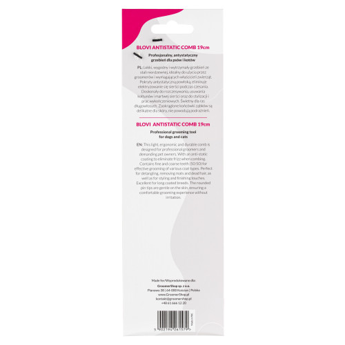 Kovový hrebeň Blovi Antistatic Comb s dĺžkou 19 cm s antistatickým povrchom a rozstupom hrotov 50/50 je praktický, ultraľahký nástroj, ktorý zaisťuje najvyššiu presnosť pri každodennom strihaní psov a mačiek. Dokonale spĺňa potreby profesionálov a majiteľov domácich zvierat, ktorí si cenia presnosť, odolnosť a vysokú účinnosť česania. Ideálny na rozčesávanie, odstraňovanie spletencov a odumretých chlpov, ako aj na styling a konečnú úpravu srsti. Antistatický povrch hrebeňa eliminuje statickú elektrinu počas česania. Antistatický hrebeň Blovi Antistatic Comb je veľmi ľahký a pohodlný, perfektne padne do ruky a znižuje únavu zápästia počas dlhého strihania. Rovné, potiahnuté hroty zaisťujú hladké kĺzanie srsti bez rizika ťahania, vďaka čomu je tento model vynikajúcou voľbou na konečnú úpravu účesov, uhladenie jemnej šteňacej srsti a strihanie krátkych až stredne dlhých domácich miláčikov. Zaoblené hroty zubov chránia citlivú pokožku vášho domáceho maznáčika pred podráždením, jemne ju masírujú a stimulujú mikrocirkuláciu, čo sa priamo premieta do lepšej výživy vlasových folikulov a rýchlejšieho rastu zdravej srsti. Robustná konštrukcia z nehrdzavejúcej ocele s dodatočným povlakom zaisťuje dlhodobú odolnosť, odolnosť voči vlhkosti a stylingovým produktom. Kľúčové vlastnosti antistatického hrebeňa Blovi 16 cm: Ideálny na styling a konečnú úpravu. Zabraňuje statickej elektrine počas česania. Rozčesáva srsť, odstraňuje zamotané a odumreté chlpy. Ľahký a pohodlný, perfektne padne do ruky a zabraňuje namáhaniu zápästia. Dokonale vyleštené hroty hladko kĺžu po srsti. Zaoblené hroty jemne masírujú pokožku domáceho maznáčika. Odolný, vyrobený z nehrdzavejúcej ocele a potiahnutý antistatickým povlakom.