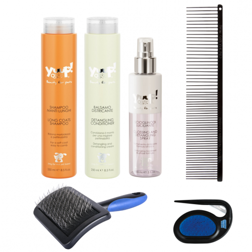 Tento balíček je špeciálne navrhnutý pre psov s dlhou srsťou, ktorí potrebujú špecifickú starostlivosť pre udržanie zdravej a krásnej srsti. Obsahuje nasledujúce produkty: - Univerzálna drôtiková kefa Show Tech DUO PIN veľ. M: Táto kefa je vhodná pre každodennú starostlivosť o dlhú srsť, pomáha odstrániť nečistoty a udržiavať srsť v dobrom stave. - Antistatický kombinovaný hrebeň Greyhound Bronze 19 cm: Tento hrebeň je ideálny na rozčesávanie dlhej srsti a vďaka antistatickým vlastnostiam zabraňuje elektrizovaniu srsti. - Prerezávač Mat splitter: Tento nástroj je určený na odstránenie strapatej srsti a pomáha pri udržiavaní srsti bez uzlíkov, čo je dôležité pre dlhú srsť. - Lesk + rozčesávací sprej pre psov Yuup 150 ml HOME: Sprej zaisťuje lesk a uľahčuje rozčesávanie dlhej srsti, čím prispieva k jej zdravej kondícii. - Reštrukturalizačný a rozčesávací kondicionér Yuup 250 ml HOME: Kondicioner je určený na reštrukturalizáciu dlhej srsti, zlepšuje jej štruktúru a uľahčuje rozčesávanie. - Šampón na dlhú srsť Yuup 250 ml HOME: Tento šampón je špeciálne formulovaný pre starostlivosť o dlhú srsť, zaisťuje jej čistotu, hebkosť a ľahké rozčesávanie. Je dôležité šampón dôkladne vypláchnuť, aby sa dosiahli optimálne výsledky. Tento balíček je ideálny pre psy s dlhou srsťou, ktorých srsť vyžaduje zvláštnu starostlivosť a pozornosť, aby zostala zdravá a krásna. Upozornenie: Nedotýkajte sa kefou pri česaní kože psíka! Prerezávač neodporúčame používať pri výstavnej srsti.