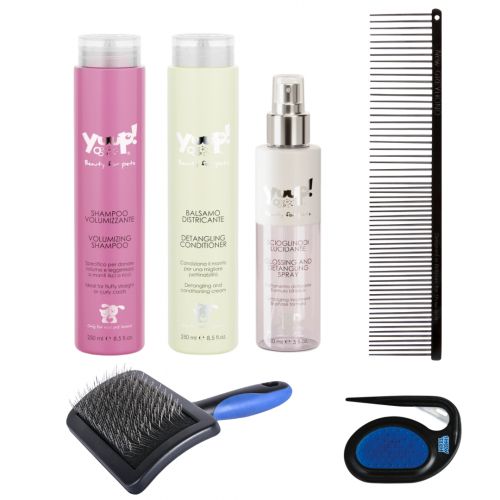 Tento balíček je špeciálne navrhnutý pre psov, u ktorých je potrebné dosiahnuť väčší objem srsti. Je ideálny pre psy s potrebou zdravej a plnej srsti a obsahuje nasledujúce produkty: - Univerzálna drôtiková kefa Show Tech DUO PIN veľ. M: Táto kefa je vhodná pre každodennú starostlivosť o srsť, pomáha odstrániť nečistoty a udržiavať srsť v dobrom stave. - Antistatický kombinovaný hrebeň Greyhound Bronze 19 cm: Tento hrebeň je ideálny na rozčesávanie srsti a vďaka antistatickým vlastnostiam zabraňuje elektrizovaniu srsti. - Prerezávač Mat splitter: Tento nástroj je určený na odstránenie strapatej srsti a pomáha pri udržiavaní srsti bez dredov. - Lesk + rozčesávací sprej pre psov Yuup 150 ml HOME: Sprej zaisťuje lesk a uľahčuje rozčesávanie srsti, čím prispieva k jej zdravej kondícii. - Reštrukturalizačný a rozčesávací kondicionér Yuup 250 ml HOME: Kondicioner je určený na reštrukturalizáciu srsti, zlepšuje jej štruktúru a uľahčuje rozčesávanie. - Objemový šampón pre psov Yuup 250 ml HOME: Tento šampón je navrhnutý tak, aby dodal srsti objem a plnosť, čo je ideálne pre psov, ktorých srsť potrebuje extra starostlivosť na dosiahnutie bohatého vzhľadu. Je dôležité šampón dôkladne vypláchnuť, aby sa dosiahli optimálne výsledky bez zanechania zvyškov. Tento balíček je ideálny pre psy, ktorých srsť vyžaduje zvláštnu starostlivosť a pozornosť, predovšetkým pokiaľ ide o dosiahnutie väčšieho objemu a plnosti srsti. Upozornenie: Nedotýkajte sa kefou pri česaní kože psíka! Prerezávač neodporúčame používať pri výstavnej srsti.
