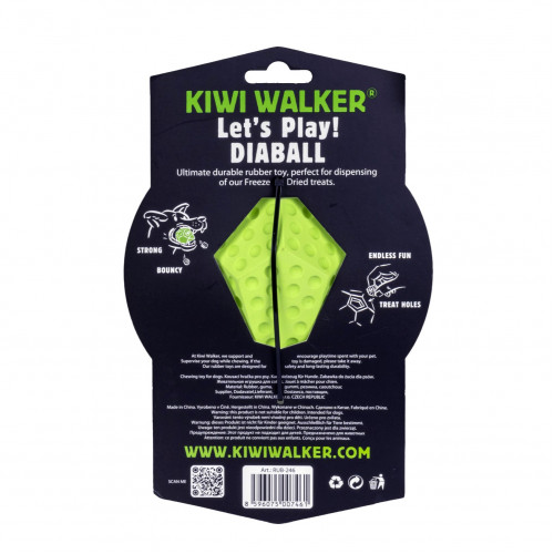 Kiwi Walker Let's Play Diaball (maxi) je hračka pre stredne veľké psy, ktorá nevyžaduje žiadne ďalšie povzbudzovanie. Jeho názov hovorí sám za seba: „Let's play“ – poďme sa baviť! Táto odolná hračka určite poteší každého psa, ktorý miluje bláznivú zábavu. Má tvar geometrického bloku, ktorý vždy inak poskakuje a poskytuje tak vášmu štvornohému priateľovi nekonečnú zábavu. Dá sa naplniť maškrtami, čo ešte viac zvýši záujem vášho psa a poskytne skvelú zábavu. Hračka je vyrobená z hustej TPR peny, ktorá je taká tvrdá a odolná, že ju aj väčší maškrtník ťažko zničí. Zároveň je veľmi príjemný, až zamatový na dotyk a šetrný k zubom a ďasnám vášho miláčika. Ani keď je pokrytý slinami, nevykĺzne majiteľovi z ruky ani z úst domáceho maznáčika. Početné razenie a jeho dizajn znamenajú, že hračka počas hry jemne masíruje zúbky a ďasná, čím ich pomáha udržiavať v dobrom stave. Hračka Kiwi Walker Let's Play Diaball je dokonalým doplnkom ku každodennej hre vášho psa, pomáha mu udržiavať ho aktívny a zdravý. Pre dosiahnutie najlepších výsledkov odporúčame pravidelné používanie a dopĺňanie maškrtami. Veľa možností, veľa vrtenia chvostom: Naplňte ho obľúbenými maškrtami vášho domáceho maznáčika. Zabezpečíte mu vášnivú a chutnú zábavu a sebe chvíľku pokoja. Kiwi Walker Diaball si môžete vziať do parku a použiť ho ako aport, keď sa hodí, pekne sa vznáša vo vzduchu a padá ďaleko. Pri náraze o zem alebo prekážku sa nepravidelne odráža a napodobňuje správanie svojej koristi v prírode. Spolu s vôňou obľúbenej maškrty šíriacou sa zvnútra je hračka skutočným potešením pre štvornohého kamaráta s vysoko vyvinutým loveckým inštinktom. Výhody hračky pre psa Kiwi Walker Let's Play: geometrický tvar vyrobený z odolnej, hustej termoplastickej peny TPR šetrnej k zubom a ďasnám štvornožca s dvoma otvormi na pamlsky možno použiť ako aport nepravidelným spôsobom sa odráža od zeme príjemný na dotyk s početným reliéfom pre ľahké uchopenie v živom stave, vhodný pre oči, ružová až zelená dĺžka: cm: 8cm váha: 205g Poznámka: Hoci je hračka vyrobená z veľmi odolnej termoplastickej peny a je celkom odolná voči prehryznutiu, určite sa nájde nejaký odvážny bojovník, ktorý urobí dielo skazy. Ak chcete, aby vám hračka slúžila čo najdlhšie, nenechávajte svojho miláčika bez dozoru a nedovoľte mu, aby ju používal ako žuvaciu hračku.