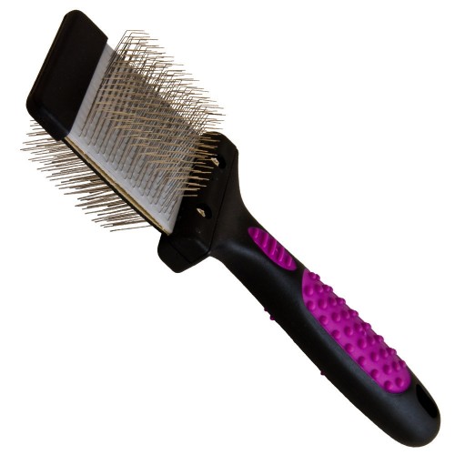 Obojstranná inteligentná flexibilná kefa KW. Určené na česanie srsti malých psov a mačiek. Vybavená pružnou hlavou, ktorá sa pod tlakom jemne ohýba, aby zaistila optimálne česanie bez toho, aby spôsobovala zvieraťu bolesť. Kefka má na oboch stranách hlavy zahnuté kovové špendlíky (svetlá strana má mäkké špendlíky, tmavá tvrdšie špendlíky). Dokonale odstraňuje uvoľnené vlasy a nečistoty. Zlepšuje prekrvenie pokožky, stimuluje vlasové folikuly a rovnomerne rozptýli prirodzene ochranné látky na vlasoch. Protišmyková rukoväť zaisťuje bezpečnú a pohodlnú prácu. Rukoväť a hlavica kefky sú vyrobené z plastu. Spôsob použitia: Rozdeľte vlasy na časti a každú časť jemne prečešte v smere rastu vlasov. Ak kefa zachytí rozcuchané vlasy, neťahajte za ňu ani silno neťahajte. Jemne ťahajte kefu plynulým pohybom, aby ste predišli poškodeniu a lámaniu vlasov. Tip: Pri česaní srsti vždy používajte prípravky na rozčesávanie. Predídete tak lámaniu a vytrhávaniu chlpov a ošetrenie bude pre vášho miláčika pohodlnejšie.