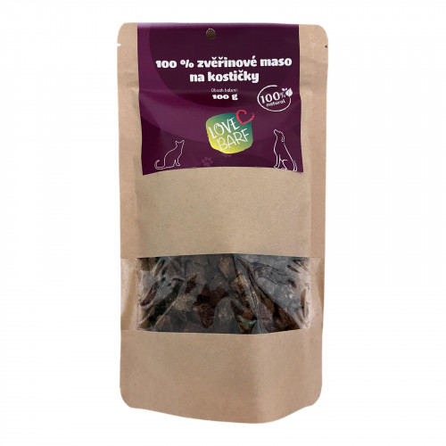 100% zverinové mäso zo zvierat z voľného chovu a bez konzervantov. Zverina je bohatá na železo, bielkoviny, vitamíny a minerálne látky. Má nízky obsah tuku a cholesterolu. Maškrta vhodná pre alergikov. Neobsahuje žiadne konzervanty. Nutrične aj chuťovo veľmi hodnotné mäso. Váha: 150 g Zloženie: Hrubý proteín: 54,9%, Hrubý olej a tuky 15,1%, Hrubý popol 12,5%, Hrubá vláknina 2,9%, Zvyšková vlhkosť 7,3%