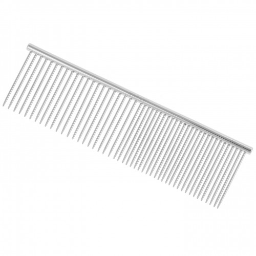 Profesionálny mimoriadne pevný hrebeň s dĺžkou 19 cm od renomovanej značky Madan. Vďaka zmiešanému rozstupu a dlhým zubom je ideálny pre plemená s dlhou a/alebo hustou srsťou. Odstraňuje odumretú srsť a dokonale vyčeše srsť. Zaoblené hroty ihiel chránia pred poranením kože. Hrebeň je pokrytý antistatickým povlakom, ktorý znižuje statickú elektrinu pri česaní vlasov. Okrúhla stopka tohto modelu perfektne padne do ruky a zaisťuje vysoký komfort používania. Tento hrebeň sa vyznačuje dobrým pomerom cena/výkon. Odporúčané pre strihačov a chovateľov O značke: Madan je značka vytvorená Williamom Lee v roku 1987 na Taiwane, ktorá pokračuje vo výrobe najkvalitnejších doplnkov pre starostlivosť o zvieratá, vrátane ikonickej Pin Brush, napájačiek a hrebeňov. Tajomstvo týchto nádherných štetcov spočíva v ich patentovanom dizajne, ktorý zabraňuje vypadávaniu a zrážaniu špendlíkov dovnútra. Na výrobu kefiek bol použitý špeciálny termoplastický polymérový materiál s prídavkom silikónovej gumy, vďaka čomu sú mimoriadne ľahké a ergonomické. Kovové špendlíky majú hladké konce, nepoškodzujú pokožku zvieraťa a dokonale rozčesávajú srsť.