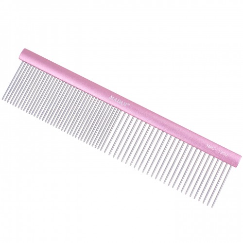 Profesionálny, extrémne ľahký hrebeň s hliníkovou rukoväťou od renomovanej značky Madan. Má rozstup zubov 50/50, vďaka čomu je ideálny pre väčšinu typov srsti. Robustné kovové hroty sú vyrobené z nehrdzavejúcej ocele a sú zasadené do jemne zaoblenej tyče. Hrebeň pohodlne padne do ruky a je veľmi pohodlný na používanie, čo zaisťuje vysoký komfort používania. Ponúka vynikajúci pomer ceny a kvality. Odporúča sa pre strihačov a chovateľov. Dostupné v dvoch farbách. Madan, značka založená Williamom Leeom v roku 1987 na Taiwane, naďalej vyrába vysokokvalitné príslušenstvo pre starostlivosť o domáce zvieratá, vrátane ikonických kefiek, napájadiel a hrebeňov. Tajomstvo týchto výnimočných kief spočíva v ich patentovanom dizajne, ktorý zabraňuje vypadávaniu alebo zrúteniu hrotov. V kefách sa používa špeciálny termoplastický polymérny materiál s pridaným silikónovým kaučukom, vďaka čomu sú mimoriadne ľahké a ergonomické. Kovové hroty majú hladké konce, nepoškodzujú pokožku zvieraťa a dokonale rozčesávajú srsť.