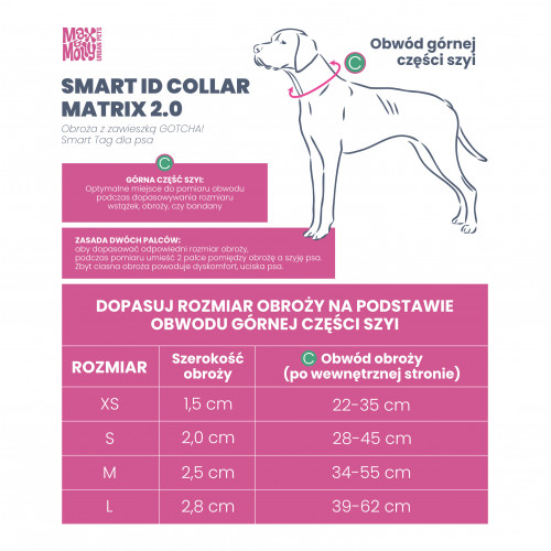 Obojok pre psa v nadčasovej a elegantnej čiernej farbe Max&Molly GOTCHA! Smart ID Matrix 2.0 obojok čierny-. Navrhnuté a vyrobené s dôrazom na každý detail, aby zabezpečili pohodlie a bezpečnosť psa a jeho majiteľa. Je ideálny na každodenné prechádzky v mestskom prostredí, ako aj na ďalšie expedície. Reflexné prešívanie po celej dĺžke zviditeľní vás aj vášho miláčika pri večerných outdoorových aktivitách. Obojok pomáha psovi vrátiť sa bezpečne k majiteľovi v prípade úniku/straty. Vďaka GOTCHA ID! s jedinečným QR kódom pripevneným ku každému obojku Max&Molly môže nálezca zvieratka naskenovať kód na štítku. Následne dostanete všetky informácie potrebné na kontaktovanie opatrovníka domáceho maznáčika a majiteľ uvidí polohu zvieratka v bezplatnej aplikácii. Obojok Max&Molly Matrix 2.0 je veľmi ľahký, pri zachovaní vysokej pevnosti a odolnosti. To všetko vďaka výberu vhodných materiálov. Je vyrobená z husto tkanej polyesterovej pásky odolnej voči oderu podšitej mäkkým, na dotyk príjemným neoprénom. Bezpečnostný zámok chráni pred náhodným odopnutím goliera. Ide o špeciálny odolný krúžok odolný voči korózii, ku ktorému sa vodítko pripája. Jeho umiestnenie na golieri bolo zvolené tak, aby odolalo tlaku vyvíjanému na pracku pri sťahovaní a tým sa minimalizovalo riziko jej odopínania. Široká škála úprav obvodu umožňuje presné prispôsobenie obojku na krk psa. Navyše, počas intenzívneho rastu šteniatka nemusíte kupovať každú chvíľu nové. Reflexné prešívanie zaisťuje bezpečnosť vášho domáceho maznáčika a dobrú viditeľnosť v tme. Po jeho obvode je pútko, ktoré zabraňuje roztrhnutiu goliera po nastavení. Obojok pre psa Max&Molly GOTCHA je jednoduché nasadiť a vyzliecť. Smart ID Matrix 2.0 Collar Black: v nadčasovej farbe a dizajne pre dospelých psov a šteniatka má GOTCHA QR ID! poskytuje vášmu miláčikovi pohodlie a bezpečnosť pri prechádzke svetlo s reflexným prešívaním vyrobené z odolnej polyesterovej pásky podšité mäkkým a pohodlným neoprénom má široké možnosti úprav, "rastie" so šteniatkom jednoduché nasadzovanie a vyzliekanie zapína sa pevnými dvoma -bodová pracka rovnomerne rozdeľuje tlak pri použití s vodítkom má bezpečnostnú poistku, ktorá chráni pred nekontrolovaným odopnutím obojku Vodítko a postroj si môžete vybrať v rovnakej farbe Výber správnej veľkosti: Obojok Max&Molly je dostupný v štyroch veľkostiach . Pri výbere správneho obojku pre vášho psa zmerajte psovi obvod krku a z tabuľky vyberte vhodnú veľkosť. Pri plánovaní nákupu obojku pre šteniatko zohľadnite jeho vývoj. Pri nasadení by mali medzi krk psa a obojok voľne zapadnúť dva stredne veľké prsty. Ak sa po zmeraní obvodu krku zmestíte medzi 2 veľkosti, vyberte si vždy tú väčšiu.
