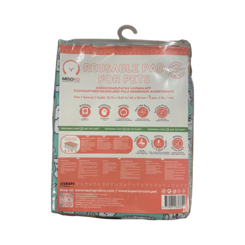 Absorpčná podložka Misoko&Co, určená pre všetkých domácich miláčikov, je vhodná na použitie pri výučbe robiť prírodné záležitosti na správnom mieste alebo pre inkontinentných seniorov. Podložka je opakovane použiteľná. Vhodné pre domáce použitie, výstavy, psie búdy. Podložka výborne absorbuje tekutiny a zanecháva povrch suchý. Táto podložka je ekonomické riešenie, pretože ju budete môcť použiť viackrát. Navyše sa ľahko udržuje - možno prať aj na 90 °C. Možno prať viac ako 300x a sušiť v sušičke pri nízkych teplotách alebo zavesiť. Tieto opakovane použiteľné podložky sú nielen ekonomickým, ale aj ekologickým riešením. Ich používaním budete chrániť životné prostredie a prispejete k udržateľnejšiemu životu. - Štyri vrstvy pre spoľahlivú ochranu - 4 vrstvy sú navrhnuté tak, aby lepšie absorbovali vlhkosť. Spodná vrstva je navyše protišmyková, trvanlivá, odolná proti roztrhnutiu a výborne pohlcuje nepríjemné pachy. 1. vrstva - 100% polyester. 2. vrstva: 95% polyester, 5% viskóza. 3. vrstva – polyuretánová (PU) laminácia. 4. vrstva - 100% polyester.