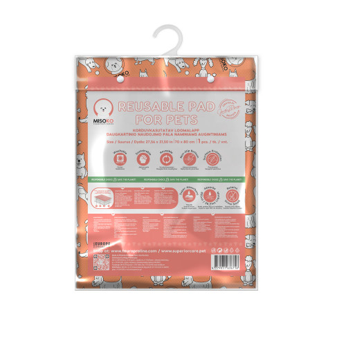 Absorpčná podložka Misoko&Co, určená pre všetkých domácich miláčikov, je vhodná na použitie pri výučbe robiť prírodné záležitosti na správnom mieste alebo pre inkontinentných seniorov. Podložka je opakovane použiteľná. Vhodné pre domáce použitie, výstavy, psie búdy. Podložka výborne absorbuje tekutiny a zanecháva povrch suchý. Táto podložka je ekonomické riešenie, pretože ju budete môcť použiť viackrát. Navyše sa ľahko udržuje - možno prať aj na 90 °C. Možno prať viac ako 300x a sušiť v sušičke pri nízkych teplotách alebo zavesiť. Tieto opakovane použiteľné podložky sú nielen ekonomickým, ale aj ekologickým riešením. Ich používaním budete chrániť životné prostredie a prispejete k udržateľnejšiemu životu. - Štyri vrstvy pre spoľahlivú ochranu - 4 vrstvy sú navrhnuté tak, aby lepšie absorbovali vlhkosť. Spodná vrstva je navyše protišmyková, trvanlivá, odolná proti roztrhnutiu a výborne pohlcuje nepríjemné pachy. 1. vrstva - 100% polyester. 2. vrstva: 95% polyester, 5% viskóza. 3. vrstva – polyuretánová (PU) laminácia. 4. vrstva - 100% polyester.