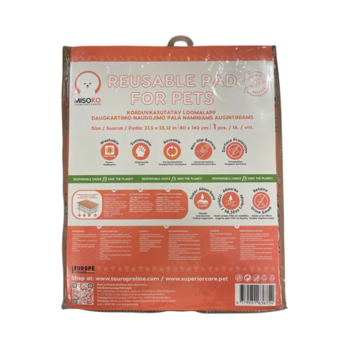 Absorpčná podložka Misoko&Co, určená pre všetkých domácich miláčikov, je vhodná na použitie pri výučbe robiť prírodné záležitosti na správnom mieste alebo pre inkontinentných seniorov. Podložka je opakovane použiteľná. Vhodné pre domáce použitie, výstavy, psie búdy. Podložka výborne absorbuje tekutiny a zanecháva povrch suchý. Táto podložka je ekonomické riešenie, pretože ju budete môcť použiť viackrát. Navyše sa ľahko udržuje - možno prať aj na 90 °C. Možno prať viac ako 300x a sušiť v sušičke pri nízkych teplotách alebo zavesiť. Tieto opakovane použiteľné podložky sú nielen ekonomickým, ale aj ekologickým riešením. Ich používaním budete chrániť životné prostredie a prispejete k udržateľnejšiemu životu. - Štyri vrstvy pre spoľahlivú ochranu - 4 vrstvy sú navrhnuté tak, aby lepšie absorbovali vlhkosť. Spodná vrstva je navyše protišmyková, trvanlivá, odolná proti roztrhnutiu a výborne pohlcuje nepríjemné pachy. 1. vrstva - 100% polyester. 2. vrstva: 95% polyester, 5% viskóza. 3. vrstva – polyuretánová (PU) laminácia. 4. vrstva - 100% polyester.