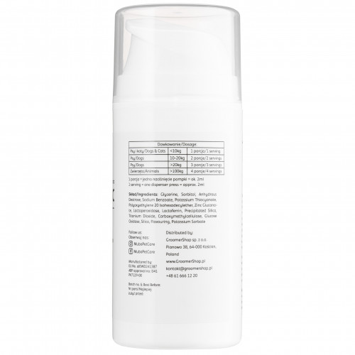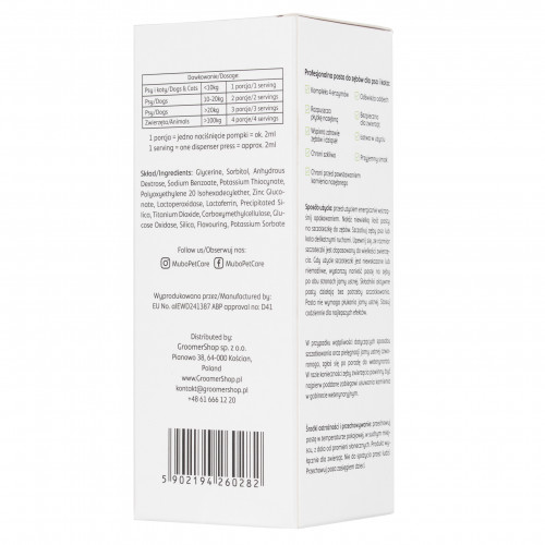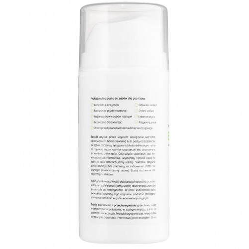 Zubná pasta Mubo EnzyMatic je profesionálna enzymatická zubná pasta pre psy a mačky. Jej pokročilé zloženie, vyvinuté s ohľadom na ústnu hygienu vášho domáceho maznáčika, je založené na pôsobení štyroch enzýmov (laktoferín, laktoperoxidáza, lyzozým a glukózooxidáza) a jemného abrazíva. Táto kombinácia pomáha rozpúšťať a odstraňovať zubný plak a usadeniny šetrným spôsobom k zubom a ďasnám. Pasta podporuje krásny a zdravý vzhľad zubov a chráni ich pred tvorbou zubného kameňa. Pasta podporuje regeneráciu tkaniva ďasien, pomáha znižovať zápaly a podráždenie. Neutralizuje tiež nepríjemný dych elimináciou prchavých zlúčenín síry – hlavnej príčiny zápachu z úst. Mubo EnzyMatic je vhodná na použitie s ultrazvukovými zubnými kefkami (napr. Emmi-Pet, Cleany Teeth) alebo ako samostatná metóda dentálnej hygieny. Vďaka prítomnosti enzýmov zubná pasta funguje aj bez čistenia zubov – to je obzvlášť dôležité pre domáce zvieratá, ktoré nemajú radi alebo z akéhokoľvek dôvodu nemôžu nechať si čistiť zuby. Jednoducho ju naneste na zuby vášho domáceho maznáčika. Nie je potrebné oplachovať a všetky zložky sú úplne bezpečné v prípade prehltnutia. Kuracia príchuť nabáda domáce zvieratá k zubnej paste, čo uľahčuje každodennú starostlivosť. Mubo EnzyMatic Professional zubná pasta pre psy a mačky: Receptúra 4 enzýmov: laktoferínu, laktoperoxidázy, lyzozýmu a glukózooxidázy rozpúšťa zubný plak a nahromadené usadeniny a chráni pred tvorbou zubného kameňa. Podporuje zdravé zuby a ďasná: Zložky pasty upokojujú podráždenie, urýchľujú regeneráciu tkanív a pomáhajú znižovať zápal v ústnej dutine zvieraťa. Chránia sklovinu. Osviežuje dych: zubná pasta má schopnosť neutralizovať prchavé zlúčeniny síry, ktoré spôsobujú nepríjemný zápach v ústach vášho domáceho maznáčika. Bezpečná pre zvieratá: jej zložky sú úplne bezpečné pri prehltnutí. Jednoduché použitie: enzýmový komplex a jemné abrazívum čistia zuby, aj keď váš maznáčik nemá rád čistenie zubov a vy nepoužívate zubnú kefku. Zubná pasta nevyžaduje oplachovanie. Príjemná chuť: kuracia aróma je pre zvieratá veľmi atraktívna. Návod na použitie: Pred použitím dôkladne pretrepte nádobu. Naneste malé množstvo zubnej pasty na zubnú kefku alebo priloženú prstovú zubnú kefku. Čistite zuby svojho psa alebo mačky jemnými pohybmi. Uistite sa, že veľkosť zubnej kefky je vhodná pre veľkosť vášho domáceho maznáčika. Ak sa používanie zubnej kefky neodporúča alebo nie je možné, jednoducho naneste pastu na obe strany ústnej dutiny. Účinné látky zubnej pasty fungujú bez nutnosti čistenia zubov. Zubná pasta si nevyžaduje oplachovanie. Pre dosiahnutie najlepších výsledkov používajte denne. Ak máte akékoľvek otázky týkajúce sa čistenia zubov a starostlivosti o ústnu dutinu, poraďte sa so svojím veterinárom. V prípade potreby by sa mali zuby vášho domáceho maznáčika najskôr odstrániť vodným kameňom na veterinárnej klinike. Dávkovanie: Psy a mačky 20 kg: 3 porcie; zvieratá > 100 kg: 4 porcie. 1 porcia = jedno stlačenie pumpičky = približne 2 ml. Zloženie: Glycerín, sorbitol, bezvodá dextróza, benzoan sodný, tiokyanát draselný, polyoxyetylén-20 izohexadecyl, glukonát zinočnatý, laktoperoxidáza, laktoferín, zrážaný oxid kremičitý, oxid titaničitý, karboxymetylcelulóza, glukózooxidáza, oxid kremičitý, aróma, sorban draselný. Bezpečnostné opatrenia a skladovanie: Zubnú pastu skladujte pri izbovej teplote, na suchom mieste mimo dosahu slnečného žiarenia. Tento výrobok je určený len na konzumáciu zvierat. Nie je určený na ľudskú konzumáciu. Uchovávajte mimo dosahu detí.
