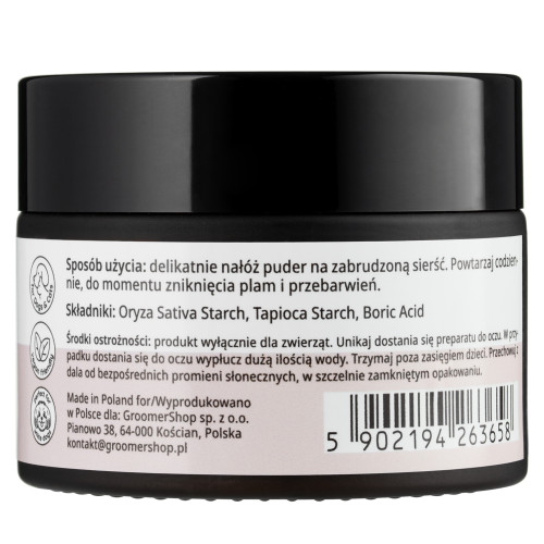 Mubo Perfect Eye Stain Powder je vegánsky prášok na odstraňovanie škvŕn a pruhov pod očami psov a mačiek. Pomáha redukovať zmenu farby srsti, ktorá je často spôsobená nadmerným slzením. Receptúra je založená na prírodných zložkách, ako je ryžový škrob, tapiokový škrob a kyselina boritá. Prášok účinne absorbuje vlhkosť zo srsti, podporuje hygienu očí a pomáha postupne znižovať výskyt sfarbenia a chrániť pred jeho opätovným výskytom. Prášok je vhodný aj na iné oblasti náchylné na škvrny, ako je tvár, labky a intímne oblasti. Mubo Perfect Eye Stain Powder je nevyhnutný pre udržanie bezchybnej srsti okolo očí bielych a svetlých plemien. Odporúča sa pre plemená psov ako maltézsky ovčiak, pudel, bišoník, shih-tzu, pekinéz, yorkshirský teriér, pomeranian a west highlander, ako aj pre perzské a exotické krátkosrsté mačky. Vhodný na časté používanie. Receptúra bez vône nedráždi psí a mačací ňufák. Jednoduché použitie, pravidelné používanie výrazne znižuje nežiaduce škvrny. Mubo Perfect Eye Stain Powder: pre psy a mačky absorbuje vlhkosť, pomáha odstraňovať škvrny a slzné škvrny pod očami. Vhodné na odstraňovanie škvŕn okolo tváre, labiek a intímnych oblastí. Obzvlášť sa odporúča pre biele a svetlosrsté plemená. Použité škroby sú bezlepkové, hypoalergénne a šetrné k citlivej pokožke. Vegánske zloženie. Jednoduché zloženie bez vône redukuje začervenanie pokožky. Jednoduché použitie na každodenné použitie. Návod na použitie: Jemne naneste prášok na zafarbené miesto, najlepšie pomocou štetca na prášok Mubo. Opakujte denne, kým škvrny a zmena farby nezmiznú. Zloženie: Škrob Oryza Sativa, tapiokový škrob, kyselina boritá. Upozornenia: Len pre zvieratá. Zabráňte kontaktu s očami. V prípade kontaktu s očami vypláchnite veľkým množstvom vody. Uchovávajte mimo dosahu detí. Skladujte mimo dosahu priameho slnečného žiarenia v tesne uzavretej nádobe.
