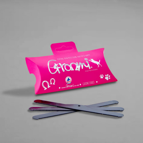 Náhradné hrebene Groomi sú 3 náhradné čepele, ktoré sa hodia na diamantový hrebeň Groomi aj na kefu na odstraňovanie nečistôt Groomi. Nová verzia čepelí bola pokrytá špeciálnym práškovým lakom, ktorý im dodáva elegantný vzhľad a zároveň zvyšuje ich odolnosť. Vďaka tomu vám bude Groomi currycomb slúžiť ešte dlhšie a zaistí efektívnu a pohodlnú starostlivosť o srsť vášho miláčika. Vlastnosti: 3ks. súčasťou dodávky, Odolný práškový náter: pre dlhšiu životnosť a lepší vzhľad, Kompatibilita: pasuje na modely Diamond Groomi Tool a Groomi Deshedding Brush, Štýlový dizajn: v ružovej alebo čiernej farbe (vyberte si svoj variant). Rozmery: dĺžka: 13,2 cm výška čepele: 12 mm (mimo montážneho priestoru) výška montážneho priestoru: 18 mm hrúbka čepele: 0,99 mm