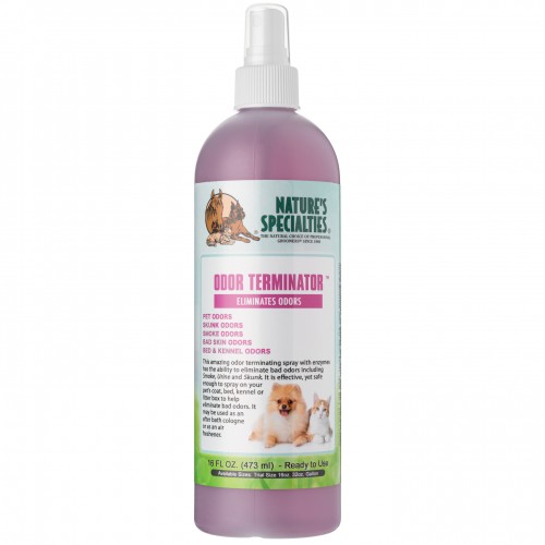 Profesionálny odstraňovač zápachu, Nature's Specialties Odour Terminator Spray. Na použitie na srsť psov a mačiek a do okolia. Môže sa používať ako osviežovač vzduchu, osviežovač srsti medzi kúpeľmi alebo ako parfum pre vášho domáceho maznáčika na konci návštevy kozmetického salónu. Vytvorené s aktívnymi enzýmami účinne a bezpečne neutralizuje a nielen maskuje nepríjemné pachy. Poradí si so zápachom moču, výkalov, cigaretovým dymom, kuchynským pachom, potom, naftou a benzínom, z kobercov, látok, klietok, postelí, podláh a dokonca aj so zápachom skunkov. Bezpečné pre šteňatá a mačiatka staršie ako 6 týždňov a menšie domáce zvieratá. Zloženie: Zmes vody, IPA, povrchovo aktívnej látky, esenciálnych olejov a vône.