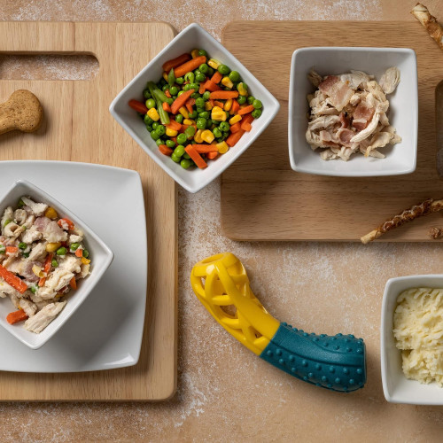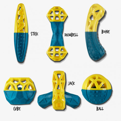 Obohaťte život svojho psa o hračku, ktorá mu poskytne fyzický aj psychický tréning, pomôže mu odfúknuť prebytočnú paru, odbúra stres a nudu a hlavne, aby sa váš pes cítil šťastný! Nuzzle Puzzle Ball je skákacia hračka na psie maškrty v tvare kosti. S pískadlom pre väčšiu zábavu Žltá časť "kostí" je vyrobená z pružnej termoplastickej gumy a modrá časť je vyrobená zo zmesi gumy a peny. Flexibilná, poloprelamovaná štruktúra uľahčuje vášmu miláčikovi chytiť hračku a umožňuje vám vložiť do nej maškrty. V pevnej časti je zase škrípanie pre väčšie zapojenie do hry. Po hodení sa hračka odrazí, niekedy nečakaným smerom, čím povzbudí ďalšie prenasledovanie. Dizajn a použité materiály sú šetrné k psej tlame. Do "kostí" môžete vtlačiť psie maškrty - cvičky alebo suché granule krmiva - ich vytiahnutie z vnútra hračky je intelektuálnou stimuláciou a výzvou pre psa. Samozrejme, hračku môžete použiť aj na aportovanie - celkom dobre hádže. A pláva na vode Výhody hračky Nuzzle Puzzle Bone: poloprelamovaná "kosť" pre psa, môžete ju naplniť pamlskami, pláva na vode, s piskotom, rôznymi textúrami a geometrickým tvarom pre lepšiu zábavu, funguje dobre ako aport - prevedenie umožňuje psovi pohodlné uchopenie, hygienické materiály, šetrné k ústam psa, ľahké: cca 120g. Rozmery kostičky Nuzzle Puzzle: Veľkosť: Dĺžka, priemer (cm): L 18,5,∅5,5 Zaujímavosť: Dvadsať minút s hračkami Nuzzle Puzzle sa rovná hodinovej prechádzke so psíkom. V sérii hračiek pre psov Nuzzle Puzzle nájdete aj mnoho ďalších tvarov. Poznámka: Nuzzle Puzzle je rad hračiek pre psov na pamlsky a aporty. Sú ľahké a plávajú na vode, ale nie sú vhodné na intenzívne hryzenie a žuvanie. Dohliadajte na hru svojho psa a kontrolujte stav hračky. Ak je poškodený, ihneď ho odstráňte. Pred prvým odovzdaním hračky psovi odstráňte všetky obalové prvky.