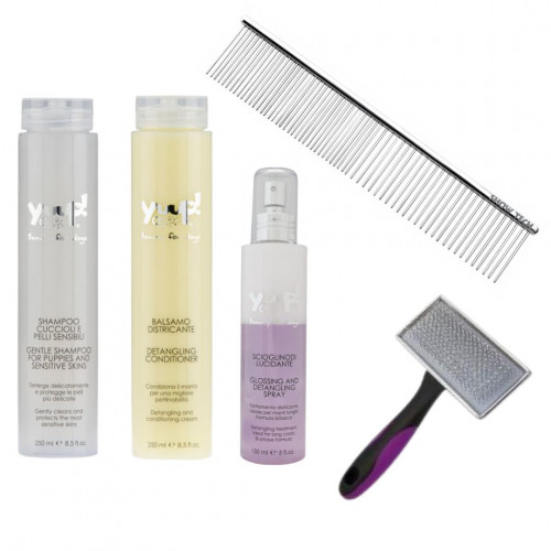 Balíček obsahuje: 1/ JEMNÝ ŠAMPÓN PRE ŠTEŇATÁ A CITLIVÉ PSY YUUP 250ML HOME 2/ REŠTRUKTURALIZAČNÝ A ROZČESÁVACÍ KONDICIONER PRE PSY YUUP 250ML HOME 3/ LESK + ROZČESÁVACÍ SPREJ HREBEŇ PRE PSOV SHOW TECH 19 CM 5/ DRÔTKOVÁ KEFKA S PLASTOVÝMI GULIČKAMI IBANEZ VEĽKOSŤ: M 113 X 52 MM.
