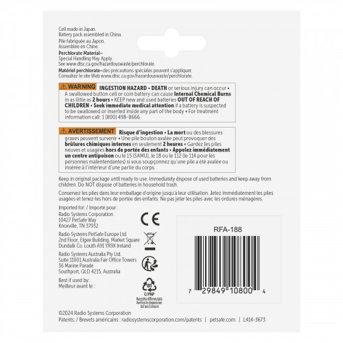 Náhradná lítiová batéria PetSafe 3V je určená na napájanie elektronických obojkov a plotov PetSafe. Je navrhnutá tak, aby zabezpečila dlhotrvajúcu a spoľahlivú prevádzku. Vďaka lítiovej technológii má batéria v porovnaní so štandardnými alkalickými batériami dlhšiu životnosť, čo znižuje frekvenciu výmeny a zaisťuje konzistentnú prevádzku zariadenia. Výmena batérie v elektronických obojkoch a plotoch PetSafe je jednoduchá a nevyžaduje žiadne ďalšie nástroje. Použitie originálnych batérií zaisťuje zachovanie záruky výrobcu a udržanie optimálneho výkonu zariadení. Kompatibilné s nasledujúcimi zariadeniami: Little Dog In-Ground Fence Little Dog In-Ground Fence Receiver Booster In-Ground Cat In-Ground Fence Receiver Booster for Cats Elite Little Dog Spray Bark Control Booster Vibration Bark Control Booster Priemerná výdrž batérie: 1-2 mesiace Bezpečnostné opatrenia: NEBEZPEČENSTVO POŽITIA. Môže spôsobiť vážne zranenie alebo smrť. Prehltnutá gombíková batéria môže spôsobiť vnútorné chemické popáleniny už za 2 hodiny. Ak máte podozrenie, že batéria bola prehltnutá alebo umiestnená do akejkoľvek časti tela, okamžite vyhľadajte lekársku pomoc. Nové a použité batérie uchovávajte MIMO DOSAHU DETÍ.