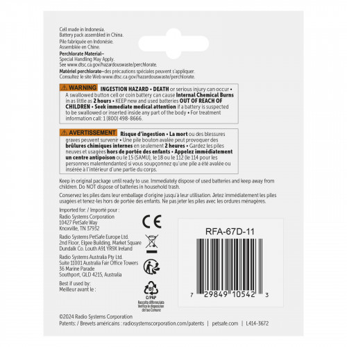 Náhradná lítiová batéria PetSafe 6V je určená na napájanie elektronických obojkov a plotov PetSafe. Je navrhnutá tak, aby zabezpečila dlhotrvajúcu a spoľahlivú prevádzku. Lítiová technológia poskytuje dlhšiu výdrž batérie ako štandardné alkalické batérie, čím sa znižuje frekvencia výmeny a zaisťuje konzistentná prevádzka zariadenia. Výmena batérie v elektronických obojkoch a plotoch PetSafe je jednoduchá a nevyžaduje žiadne ďalšie nástroje. Použitie originálnych batérií zaisťuje zachovanie záruky výrobcu a optimálny výkon zariadenia. Balenie obsahuje dve batérie. Kompatibilné s nasledujúcimi zariadeniami: Bezdrôtový systém na zadržiavanie domácich zvierat, prijímací obojok Stay&Play, bezdrôtový plot s vymeniteľnou batériou, prijímací obojok Deluxe UltraLight, prijímací obojok Basic, obojok na kontrolu štekania, bezdrôtový systém na zadržiavanie domácich zvierat, bezdrôtový plot Stay&Play s vymeniteľnou batériou, obojok Basic, zapustený plot, systém zapusteného plotu. Priemerná výdrž batérie: 1 – 3 mesiace. Bezpečnostné opatrenia: NEBEZPEČENSTVO PREHĹTENIA. Môže spôsobiť vážne zranenie alebo smrť. Prehltnutá gombíková batéria môže spôsobiť vnútorné chemické popáleniny už za 2 hodiny. Ak máte podozrenie, že batéria bola prehltnutá alebo umiestnená do akejkoľvek časti tela, okamžite vyhľadajte lekársku pomoc. Nové aj použité batérie uchovávajte mimo dosahu detí.
