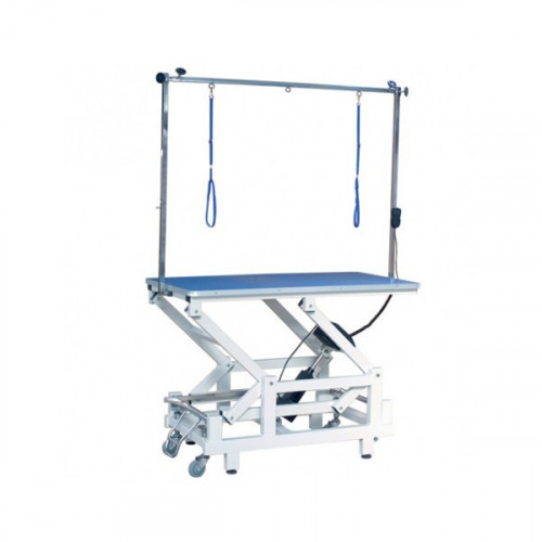 Profesionálny stôl na strihanie psov s elektrickým zdvihom a pevnou doskou s rozmermi 120 x 65 cm. Doska je pokrytá protišmykovou gumou. Stôl je výškovo nastaviteľný od 58 do 97 cm. Zdvih sa ovláda ovládačom, ktorý je možné pripevniť magnetom na rameno pre úväzy. Biely oceľový rám je ošetrený epoxidom. 4 nastaviteľné nohy, 4 kolesá. Pokiaľ zošliapnete pedál, je možné so stolom pohybovať na kolesách. Uľahčí Vám to čistenie a otáčanie stola. Pokiaľ nie je stôl v čase objednania skladom, objednávame ho u dodávateľa po uhradení zálohovej faktúry.