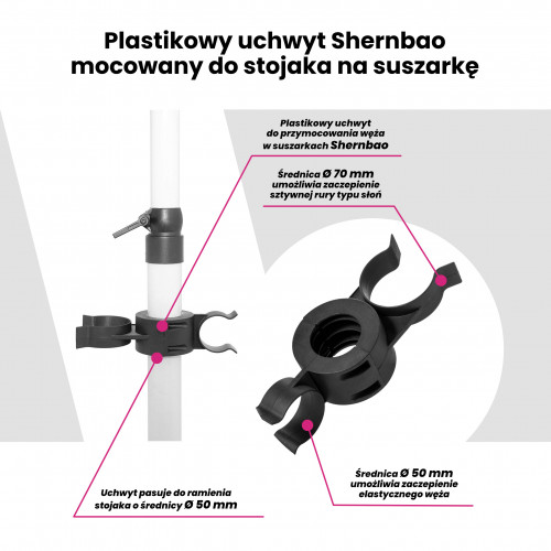 Plastový držiak hadice pre sušičky Blovi a Shernbao, pripevnený k stojanu