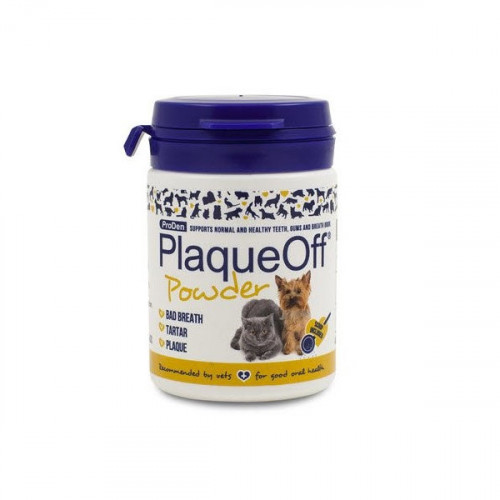 PlaqueOff™ Powder je prelomový prostriedok v starostlivosti o zuby a ďasná psov a mačiek. Významne obmedzuje zubný povlak a zubný kameň a odstraňuje zápach z papule. Prípravok je vo forme prášku a preto sa ľahko pridáva do bežnej potravy. Na rozdiel od ostatných metód odstraňovania zubného povlaku pôsobí prípravok systematicky. Cez zažívací trakt sa dostáva do krvného riečišťa az neho potom do slín, kde rovnomerne pôsobí na ďasná a na všetky zuby. Ovplyvňuje schopnosť zachytávania baktérií, ktoré sa podieľajú na vzniku zubného povlaku a zmäkčuje už vytvorený zubný kameň. Klinické štúdie vykonané na ľuďoch preukázali, že akumulácia látok na zubnej sklovine je redukovaná až o 88 % a zubný kameň buď úplne zmizol, alebo sa stal veľmi poréznym a tak ľahko odstrániteľným. Zubná starostlivosť je bohužiaľ jednou z najviac prehliadaných zdravotných problémov, s ktorými sa majitelia zvierat zaoberajú. Rovnako ako u ľudí, sa baktérie neustále tvoria v ústach všetkých mačiek a psov. Akonáhle je plaketa kalcifikovaná do zubného kameňa, už ju nemožno odstrániť. V mnohých prípadoch je nutné odstraňovať pomocou veterinára, pomocou ultrazvuku a anestetika. Ak je prevencia zubného kameňa ponechané neupravené, môže to mať za následok zlý dych, chorobu ďasien, zubný kaz a predčasné straty zubov. Tatár, ktorý môže zostať príliš dlho, môže tiež spôsobiť infekcie, ktoré sa môžu šíriť po celom tele a poškodiť srdce, pľúca, pečeň a negatívne ovplyvniť funkcie obličiek.