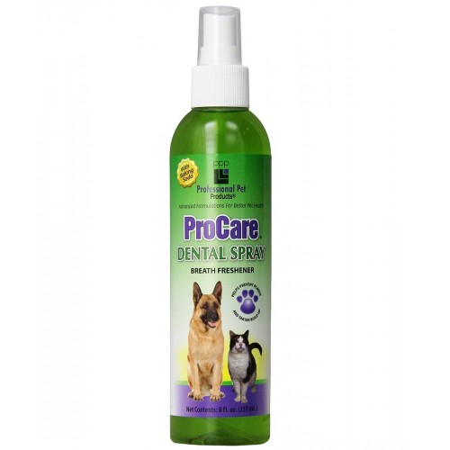 PPPP ProCare Dental Spray je prípravok vo forme spreja na šetrné čistenie zubov a ďasien. Účinne pomáha v boji proti pretrvávajúcemu zubnému kameňu a osviežuje dych. Obsahuje upokojujúce vlastnosti aloe. Jeho pravidelné používanie zabraňuje usadzovaniu plaku a zubného kameňa a udržiava ústnu dutinu vášho domáceho maznáčika v dobrom stave. Produkt pre psov a mačky. Nevyžaduje oplachovanie Spôsob použitia: Pred použitím pretrepte. Nastriekajte do úst zvieraťa. nevyžaduje oplachovanie.