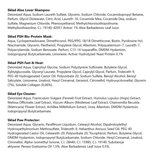 Profesionálna kozmetická sada PSH Pet Box Beauty Ritual Best Sellers Pro pre psov a mačky. Obsahuje najobľúbenejšie produkty potrebné pre starostlivosť o srsť. Elegantná kovová plechovka uľahčuje skladovanie a robí zo sady perfektný darček. Sada PSH Pet Box Beauty Ritual Best Sellers Pro obsahuje: PSH Pro Aloe Lover Shampoo 300ml - intenzívne hydratačný šampón s aloe vera, koncentrát 1:4; PSH Pro Bio Protein Mask 150ml - proteínová maska na poškodenú psiu srsť, bez oplachovania; PSH Fast & Heat 100ml - tepelne ochranný sprej pre psov a mačky, ktorý urýchľuje schnutie; PSH Eye Cleaner 50ml - čistiaci prostriedok na oblasť očí u psov a mačiek; PSH Paw Protector 50ml - hydratačný a ochranný krém na psie labky. PSH Aloe Lover Shampoo je profesionálny hydratačný šampón pre suché, poškodené a krehké psy a mačky. Obzvlášť sa odporúča pre plemená s dlhou alebo hustou srsťou. (Lhasa Apso, Yorkshirský teriér, Maltézsky teriér, Shih-Tzu, Afganský chrt atď.) Môže sa používať u domácich miláčikov s citlivou pokožkou, ktoré vyžadujú jemnú starostlivosť počas umývania. Produkt obnovuje prirodzenú textúru, mäkkosť a lesk srsti a zároveň rozjasňuje vyblednutú a matnú farbu srsti. Aloe vera zaisťuje optimálnu hydratáciu srsti aj pokožky, upokojuje podráždenie pokožky a chráni pred škodlivými faktormi prostredia, ako je slnečné žiarenie alebo horúci vzduch z fénu. Šampón prispieva k správnej funkcii hydrolipidového filmu, dodáva lesk, zjemňuje a vyhladzuje srsť. Jemná vôňa odstraňuje nepríjemné pachy zo srsti vášho domáceho maznáčika. Šampón uľahčuje česanie a zabraňuje zamotávaniu a strapateniu. Neobsahuje parabény ani silikóny a jeho vegánske zloženie znamená, že pri jeho výrobe neboli použité žiadne zložky živočíšneho pôvodu. Koncentrát 1:4. Návod na použitie: Naneste zriedený šampón na mokrú srsť, rovnomerne vmasírujte a nechajte pôsobiť 1-2 minúty, potom dôkladne opláchnite. Na silne znečistenú alebo veľmi poškodenú srsť použite neriedený šampón. PSH Fast & Heat: profesionálny kondicionér pre psov a mačky, urýchľuje schnutie a poskytuje vynikajúcu tepelnú ochranu, čím zabraňuje poškodeniu spôsobenému horúcim vzduchom. Obohatený o kolagén, zdroj aminokyselín, ktoré posilňujú a vyživujú srsť, a glycerín, ktorý hydratuje a vyhladzuje, čím chráni pred stratou vlhkosti. Tento kozmetický prípravok je ideálny na zjednodušenie práce a úsporu času stráveného strihaním srsti vášho domáceho maznáčika. Nevyhnutný v salónoch pre strihanie. Vhodný aj pre výstavné psy a mačky, ktorých srsť môže byť oslabená častým strihaním. Návod na použitie: Pred použitím dobre pretrepte. Nastriekajte na umytú, vlhkú srsť a potom vyfúkajte. PSH Bio-Protein Mask: Profesionálna hydratačná a vyživujúca maska pre psov, PSH Bio-Protein Mask nevyžaduje oplachovanie. Je určená na použitie na všetky typy srsti a odporúča sa pre psov so zlým stavom srsti spôsobeným nedostatkom vitamínov v dôsledku nesprávnej alebo nedostatočnej výživy. Jeho vitamínový komplex (vitamíny skupiny B, biotín, niacínamid) a proteíny získané z hydrolyzovaných kvasníc prenikajú hlboko do vlasového vlákna a obnovujú poškodené vrstvy. Maska dodáva srsti elasticitu a odolnosť a zanecháva ju hodvábne hladkú a lesklú. Ďalšou výhodou je, že uľahčuje česanie a zabraňuje zamotávaniu a strapateniu srsti. Maska má príjemnú konzistenciu, ľahko sa vstrebáva a nezanecháva mastné zvyšky. Nie je potrebné oplachovať. Návod na použitie: Aplikujte po umytí psa na mokrú (uterákom osušenú) alebo úplne suchú srsť. Bioproteínovú masku rovnomerne rozotrite po srsti psa v smere srsti a jemne masírujte. NEOPLACHUJTE. Češte s teplom alebo bez neho. Uchovávajte mimo dosahu detí. PSH Eye Cleaner: produkt na čistenie oblasti očí psov a mačiek. Ľahko odstraňuje všetky nečistoty a sekréty. Pravidelné používanie zabraňuje nevzhľadnému zafarbeniu srsti spôsobenému trhaním. Zabraňuje rastu nebezpečných baktérií, plesní a vírusov, ktoré môžu viesť k zápalom a infekciám očí. Produkt chráni citlivú oblasť očí pred hmyzom. Je vyrobený s prírodnými zložkami, vrátane extraktu z feniklu, extraktu z chmeľu, harmančeka a medovky lekárskej, a má antibakteriálne, protizápalové a osviežujúce vlastnosti. Pridanie alantoínu upokojuje podráždenia a urýchľuje regeneráciu epidermy. Na použitie doma aj vo veterinárnych ordináciách. Návod na použitie: Naneste malé množstvo krému na sterilný gázový tampón a utrite oblasť očí. PSH Paw Protector 50ml: špecializovaný krém na labky, PSH Paw Protector, určený na starostlivosť o citlivú pokožku psov a mačiek. Použitie krému má profesionálny účinok.