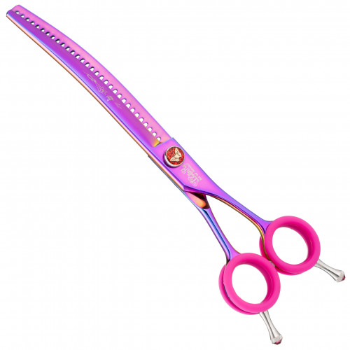 Nožnice P&W ButterFly Curved Chunker 7,5" Zakrivené nožnice Chunker. Skvelý nástroj na dokončenie prác vykonávaných ostrými nožnicami alebo strojčekom. Ideálna voľba pre hustú, kučeravú srsť – pre rýchle a rovnomerné tvarovanie kučier – ako aj pre psy s dvojitou srsťou. Zakrivený tvar čepele uľahčuje dosiahnutie požadovaného tvaru účesu pre plemená vyžadujúce polkruhové tvary. Vyrobené z pevnej ocele s ružovým opálovým povlakom. Riediace nožnice sú vybavené 31 širokými zubami s mikrobrúsením, ktoré zabraňuje skĺznutiu srsti počas stylingu, čo vedie k jednoduchšej práci s nepoddajnou srsťou, poskytuje väčšiu kontrolu nad strihom a minimalizuje riziko nerovností alebo poškodenia srsti. Pohodlná, symetrická rukoväť zaisťuje vysoký komfort používania optimálnym rozložením tlaku na ruku a prsty a vynikajúcou kontrolou nad nástrojom. Rukoväť je vybavená obojstrannými háčikmi zdobenými ružovými zirkónmi. Mäkké silikónové krúžky a gumená zarážka zaisťujú maximálne pohodlie pri strihaní. Nožnice P&W ButterFly Curved Chunker sú perfektným riešením pre tých, ktorí hľadajú kvalitné vybavenie za prijateľnú cenu. Ich Unikátne farby a krásna, dúhová povrchová úprava ich robia neuveriteľne atraktívnymi. Ozdobná skrutka v tvare motýľa dodáva ich šarm. Budú vyzerať skvele v každom salóne pre úpravu srsti. Dodávajú sa v originálnom puzdre s logom výrobcu. Vlastnosti nožníc P&W ButterFly Curved Chunker: veľkosť 7,5", robustná konštrukcia, ideálne na dokončenie strihania po strihaní nožnicami alebo strojčekom, ideálne pre husté, kučeravé vlasy, zakrivená čepeľ uľahčuje kreslenie zakrivených čiar, 31 širokých zubov (chunkers), mikrobrúsenie, zvládajú nepoddajnú srsť, bezpečné pre srsť a nepoškodzujú jej štruktúru, pohodlná, symetrická rukoväť, obojstranné opierky na prsty, silikónové krúžky v očkách, gumený tlmič nárazov na rukoväti, atraktívny, opaleskujúci povrch, zodpovedajúce puzdro s logom výrobcu. UPOZORNENIE! Všetky produkty P&W Scissors sa dodávajú iba v rámci Poľska! Farby krúžkov sa môžu líšiť od farieb zobrazených na fotografii a dodávajú sa náhodne.